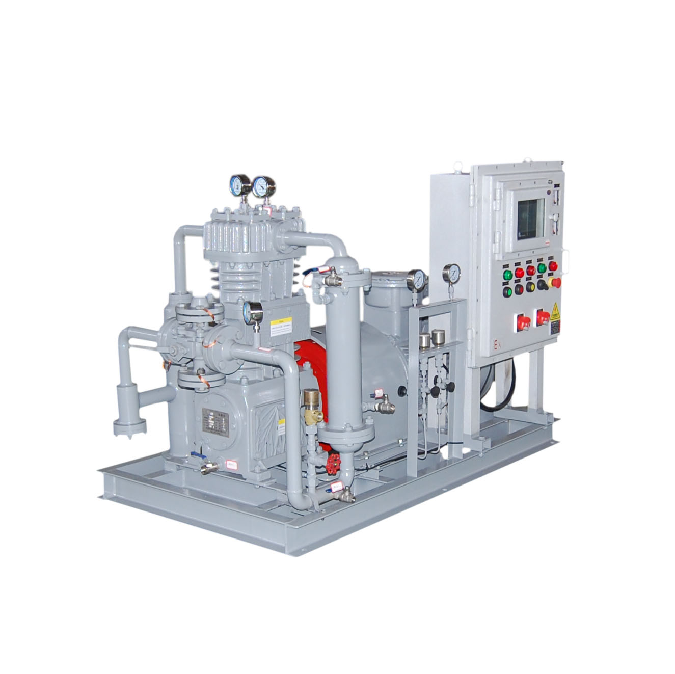 環(huán)己烷壓縮機(jī)是我公司新型產(chǎn)品,它集壓縮機(jī)、氣液分離器、安全閥冷卻器、電動(dòng)機(jī)等為一體,成一完整的機(jī)組。具有功能多、體積小、重量輕、功率小、運(yùn)行平穩(wěn)可靠等特點(diǎn),并有良好的安全性能。它為輸送氫氣,可為用戶最大限度地創(chuàng)造經(jīng)濟(jì)效益。由于采用獨(dú)特的無(wú)油潤(rùn)滑設(shè)計(jì),氣缸內(nèi)無(wú)需用油潤(rùn)滑,因而不會(huì)對(duì)介質(zhì)造成污染,使被輸送物質(zhì)保持純凈。本機(jī)設(shè)計(jì)成機(jī)組型式,許多管線上的附件都安裝在機(jī)組上,省卻了氣液分離器、穩(wěn)壓罐、安全閥、進(jìn)氣過(guò)濾器等,減小了機(jī)房的面積,減少了操作維護(hù)工作量,節(jié)省了投資。